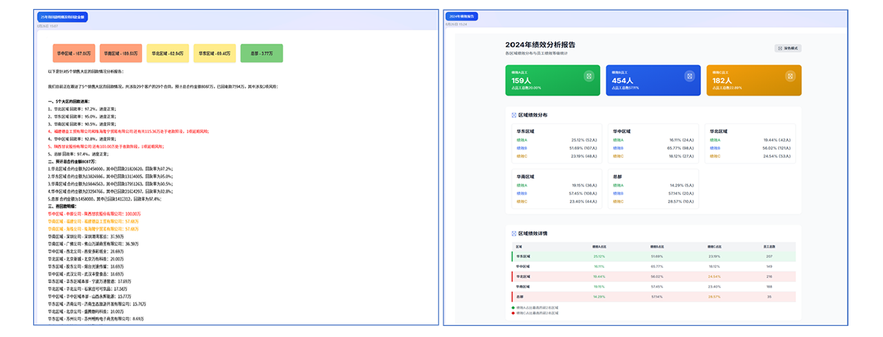 - 报表生成,如查询“25年销售目标达成及去年对比”,以“秒”的速度快速生成业务报表,可下载。同理,如日报、周报、月报、年报也可一句话生成。