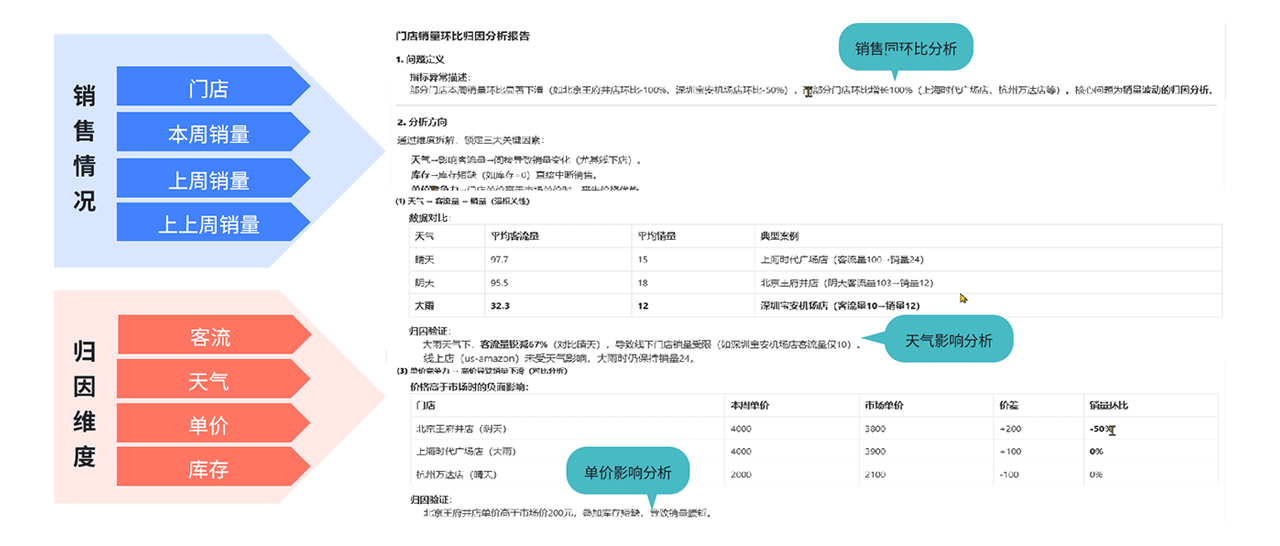 - 归因分析:以当前门店销售情况为例:根据销售上升下降情况,要求从客流、天气、单价、库存等进行归因分析并给出。